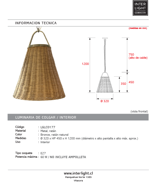 | Potencia máxima: | 60 W / NO INCLUYE AMPOLLETA |