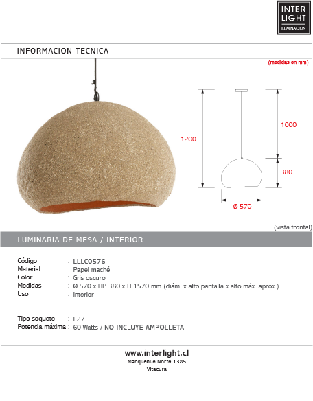 Potencia máxima: 60 Watts / NO INCLUYE AMPOLLETA