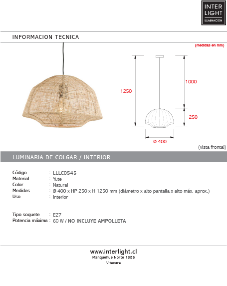 | Potencia máxima: | 60 Watts / NO INCLUYE AMPOLLETA |