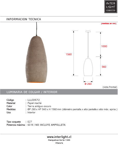 | Potencia máxima: | 60 Watts / NO INCLUYE AMPOLLETA |