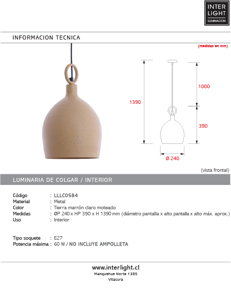 | Potencia máxima: | 60 Watts / NO INCLUYE AMPOLLETA |
