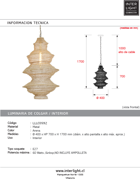| Potencia máxima: | 60 Watts / NO INCLUYE AMPOLLETA |