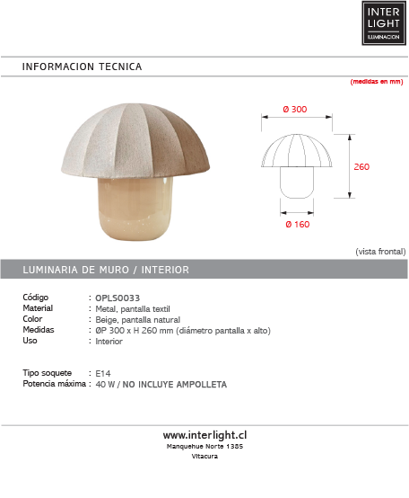 | Medidas: | ØP 300 x H 260 mm (diámetro pantalla x alto) |
