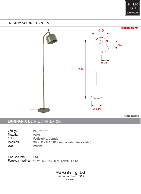 Potencia máxima: 40 W / NO INCLUYE AMPOLLETA