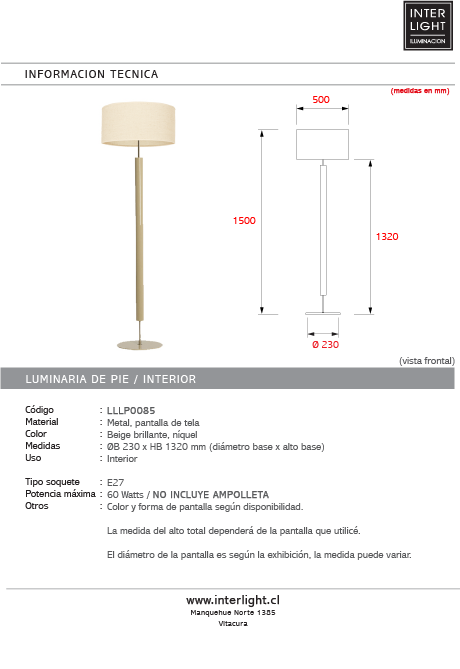 | Potencia máxima: | 60 W / NO INCLUYE AMPOLLETA |