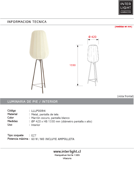 Medidas: ØP 420 x HB 1330 mm (diámetro pantalla x alto)