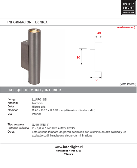| Potencia máxima: | 2 x 3,8 W / INCLUYE AMPOLLETAS |