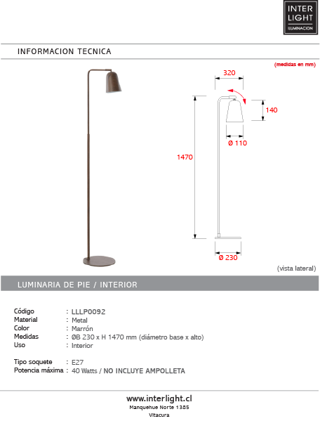 | Potencia máxima: | 40 W / NO INCLUYE AMPOLLETA |