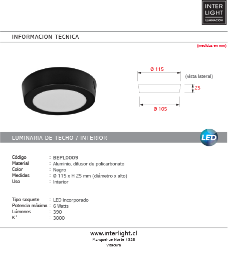 Plafón aluminio negro  Ø11,5 cm LED 6W - BEPL0009