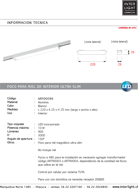 Foco para riel magnético ultra slim. No incluye riel Focos a 48V, para la instalación es necesario agregar transformador código ARTR0003 o ARTR0004, dependiendo Control por celular por sistema TUYA Para uso con domótica se necesita receptor ZIGBEE |
