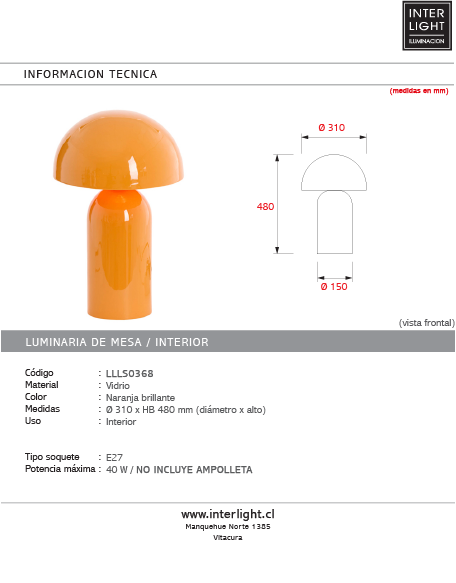 | Potencia máxima: | 60 W / NO INCLUYE AMPOLLETA |