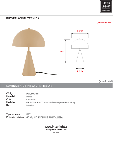 Medidas: ØP 250 x H 350 mm (diám. base x alto pantalla x alto)