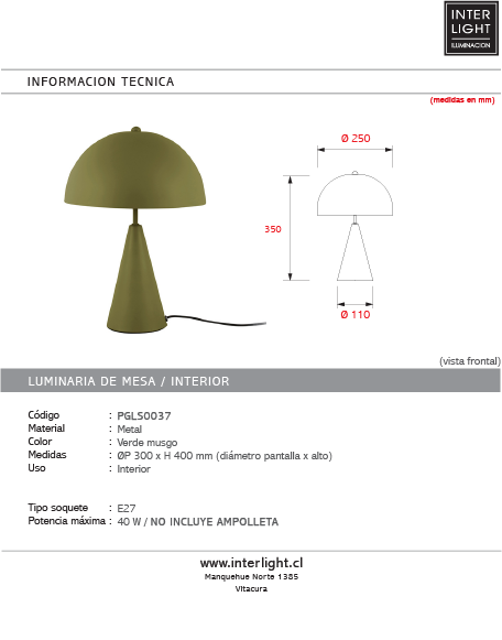 Medidas: ØP 250 x H 350 mm (diám. base x alto pantalla x alto)