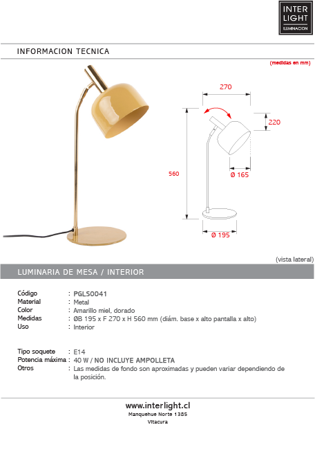 Medidas: ØB 195 x F 270 x H 560 mm (diám. base x alto pantalla x alto)